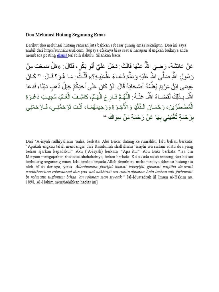 Jika anda memiliki banyak hutang, silakan amalakan jika engkau mau mengamalkannya, allah akan meluaskan rezekimu untuk melunasi semua hutangmu, walaupun hutangmu sebesar gunung banyaknya. Doa melunasi hutang sebesar gunung. Doa untuk segera melunasi hutang tersebut hendaklah dibaca setiap shalat dan sebelum tidur. Memiliki hutang yang segunung memang berdampak buruk pada pikiran serta hati. Doa terbebas dari hutang mp3 duration 2:22 size 5.42 mb / banghen.com 2. Amalkan doa melunasi hutang ini dengan tekun dan isitiqomah. Contohnya adalah sahabat rasulullah yang bernama muaz bin jabal yang terjerat hutang kepada. Banyak orang yang tidak tahan. Telah diceritakan dari zuhair bin harb, telah diceritakan dari jarir, dari suhail, ia berkata, abu shalih telah memerintahkan kepada kami bila salah seorang di antara kami hendak tidur, hendaklah berbaring di sisi kanan. Berdoalah agar bisa lunas hutang karena melunasi hutang wajib hukumnya didalam islam. Doa melunasi hutang ini adalah doa yang diajarkan oleh rosullullah terdahulu. Termasuk dalam segala kebutuhan rumah tangga. Doa ini sebenarnya adalah pelancar rezeki dimana anda yang rajin dan istiqomah mengamalkan doa ini insya allah berapapun hutang anda dalam waktu dekat.